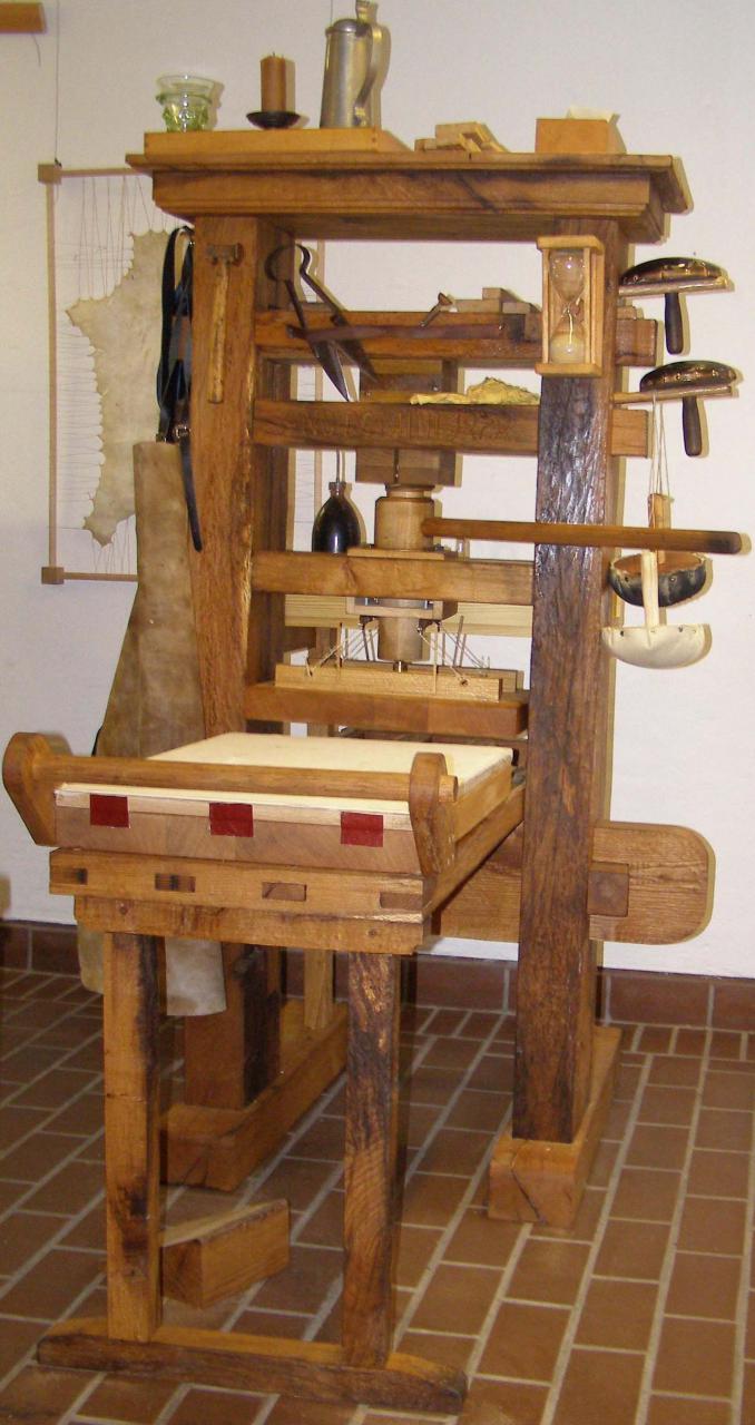 Das papier wurde in eine eigens erfundene druckerpresse eingespannt.